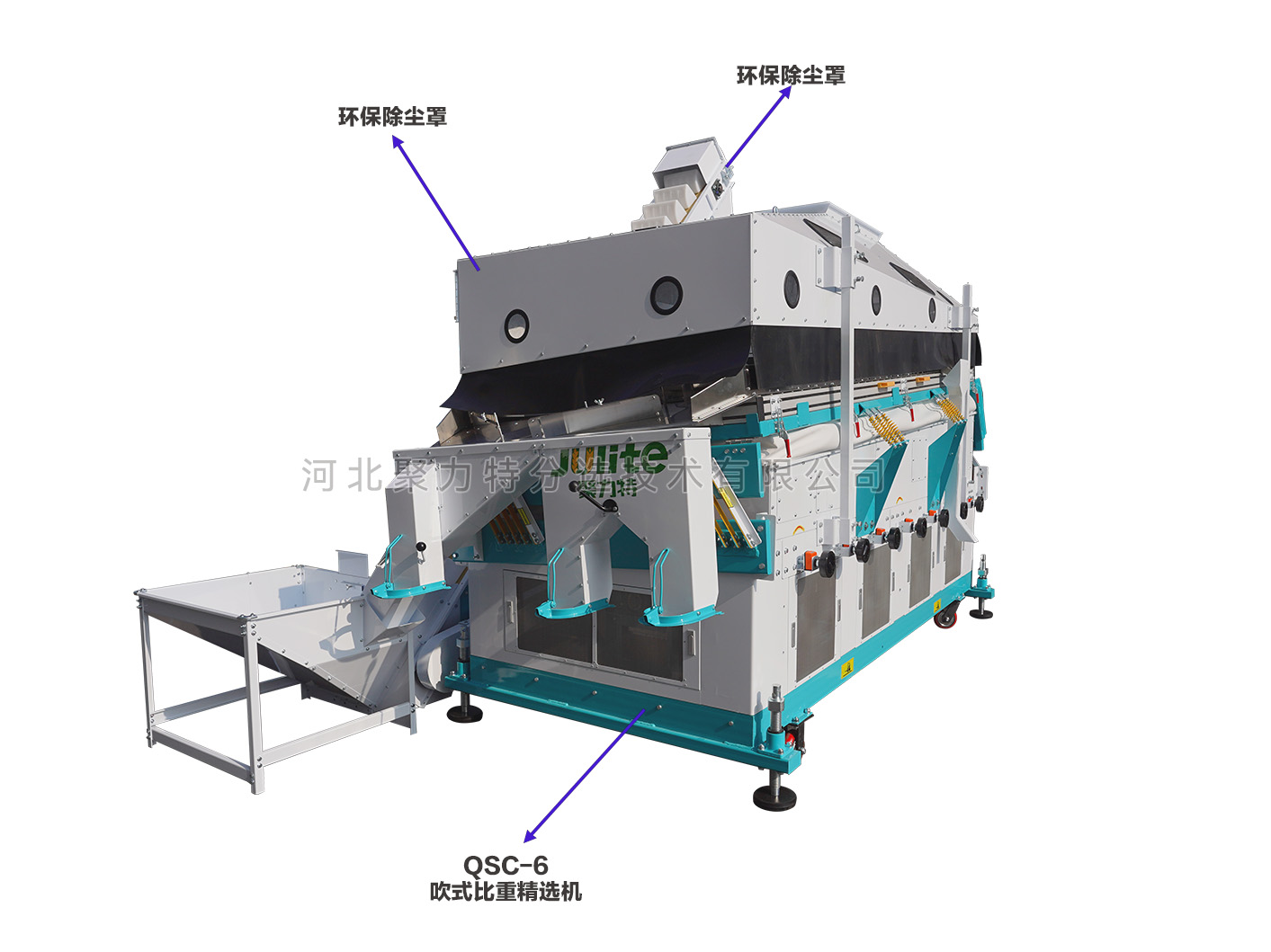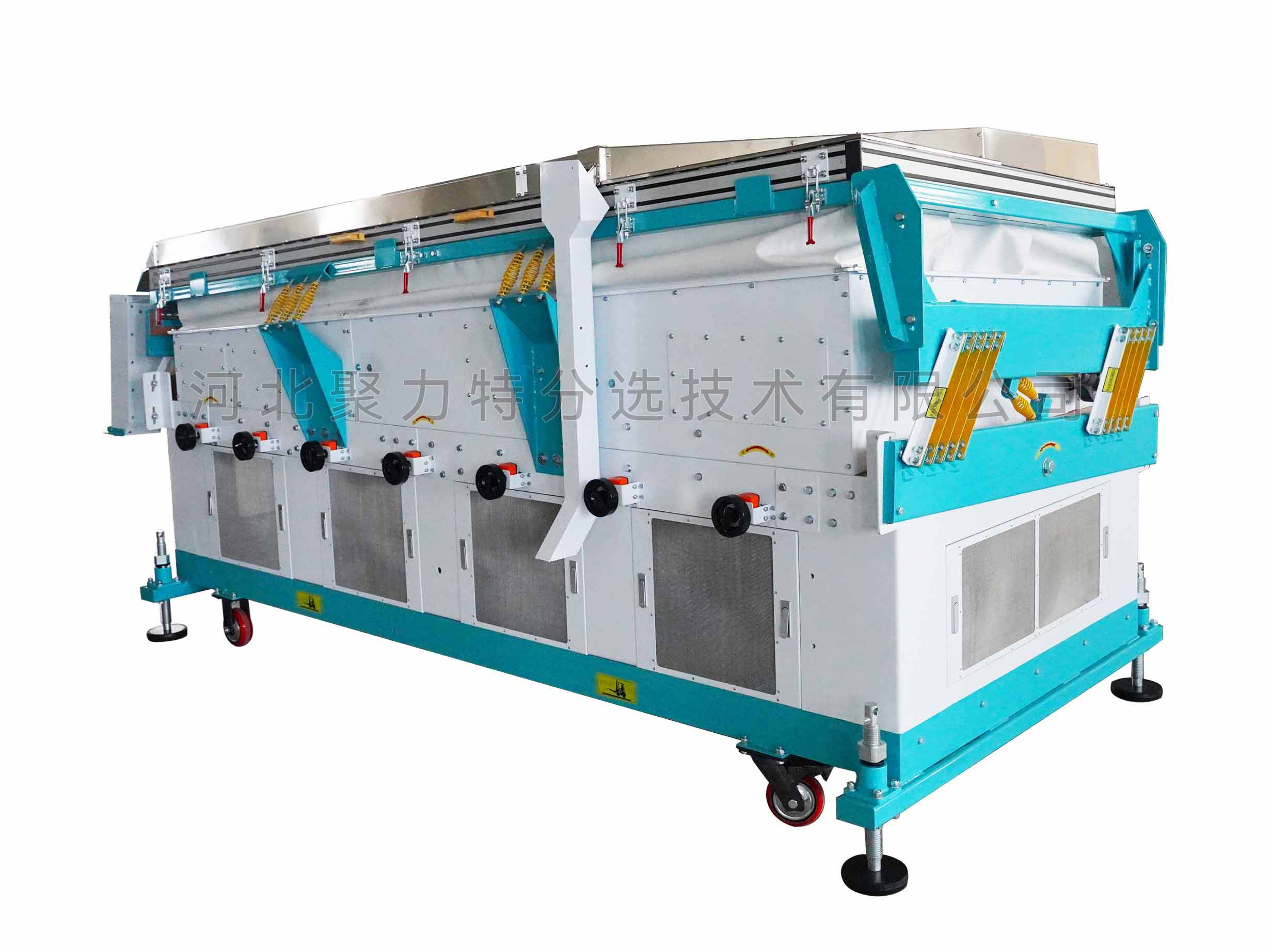 吹式比重精選機(jī)是根據(jù)物料在空氣動(dòng)力和振動(dòng)摩擦力的雙重作用下產(chǎn)生比重偏析的原理,通過(guò)調(diào)整風(fēng)壓、振幅等技術(shù)參數(shù),使比重較大的物料沉到底部貼著篩面由低向高運(yùn)動(dòng);比重較小的物料懸浮在表面由高向低運(yùn)動(dòng),從而達(dá)到比重分離的目的。有效去除物料中的秕籽、芽籽、蟲(chóng)蛀粒、霉變粒、黑粉病粒等比重較輕的雜質(zhì);同時(shí)比重精選機(jī)振動(dòng)臺(tái)面上部設(shè)有一個(gè)去石傾角,能將物料中的石子分離出來(lái)。