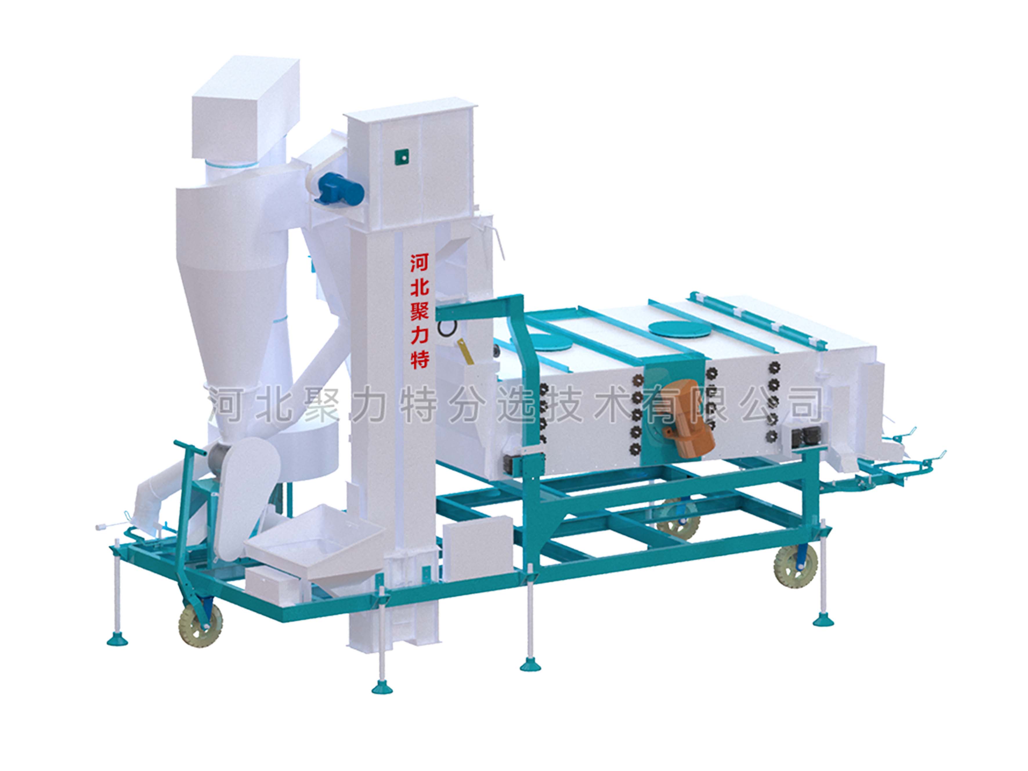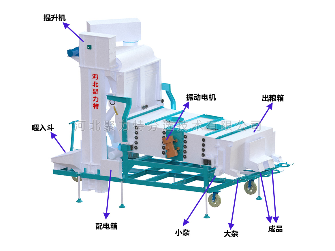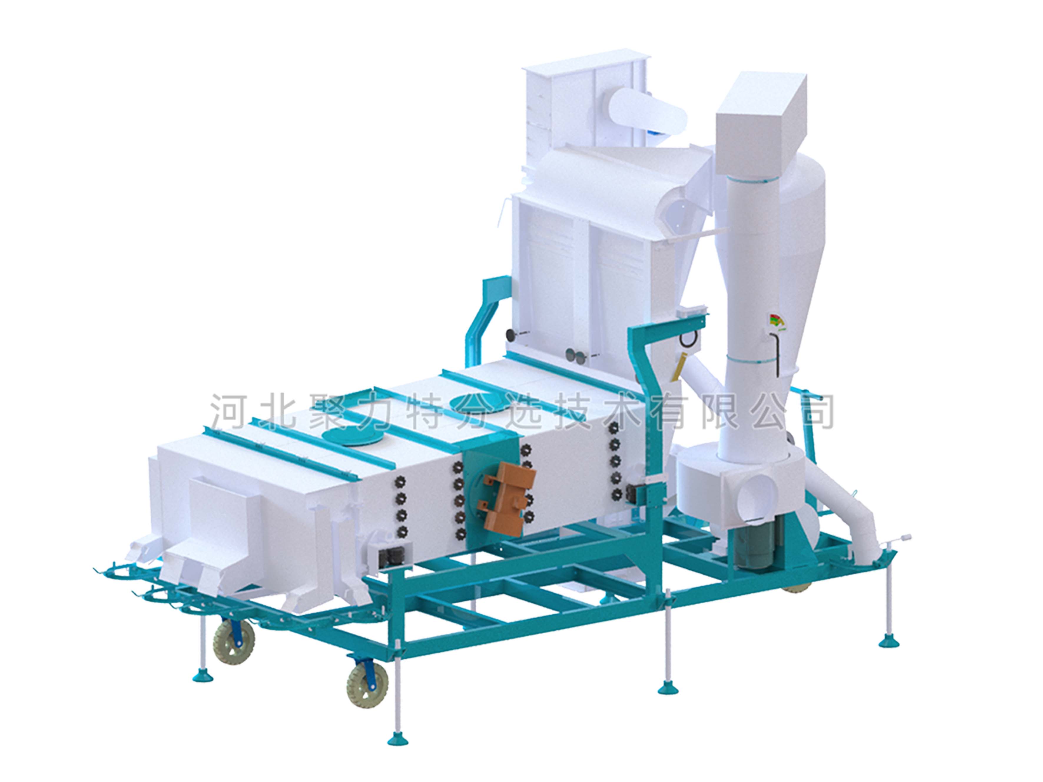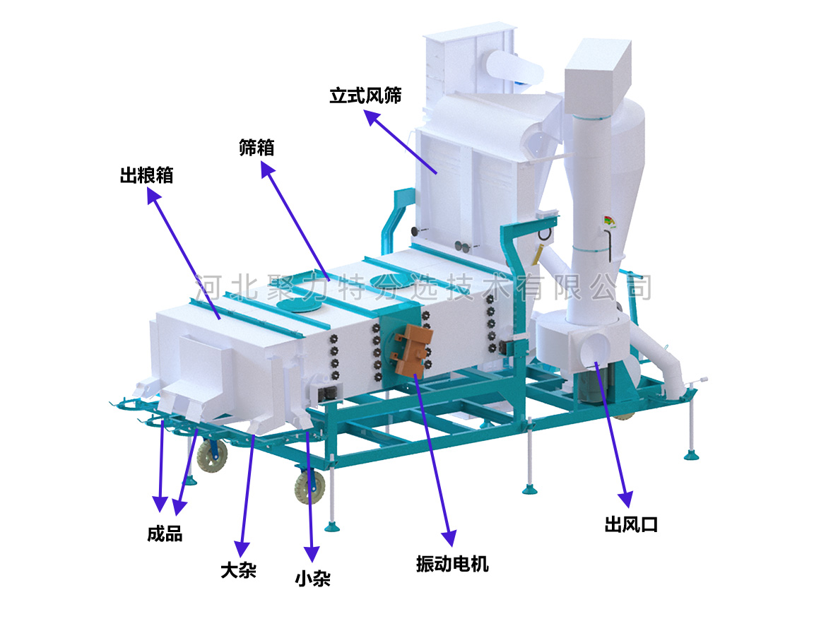 物料通過提升機進入散糧箱,散糧均勻后進入立式空氣篩,物料在風力的作用下分離出輕雜質(zhì),經(jīng)旋風除塵器過濾后,由閉風器排出。物料進入振動篩,根據(jù)物料的外形尺寸來調(diào)整不同規(guī)格的精密沖孔篩片,去除大雜和小雜同時通過增減篩片的層數(shù)將成品分成大粒和中小粒。